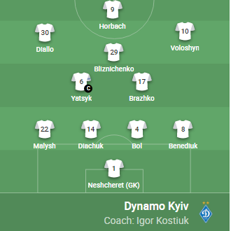 «Динамо» КиевU-19: Нещерет, Малыш, Дячук, Боль, Бенедюк (Танчак, 46), Яцик, Бражко, Близниченко, Диалло, Волошин, Горбач (Царенко, 46)